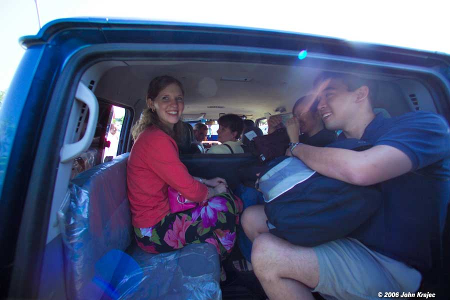 And the squeeze. This was to be a normal position for the hour long ride to and from the class... but for now it's just taking us to the motel.
